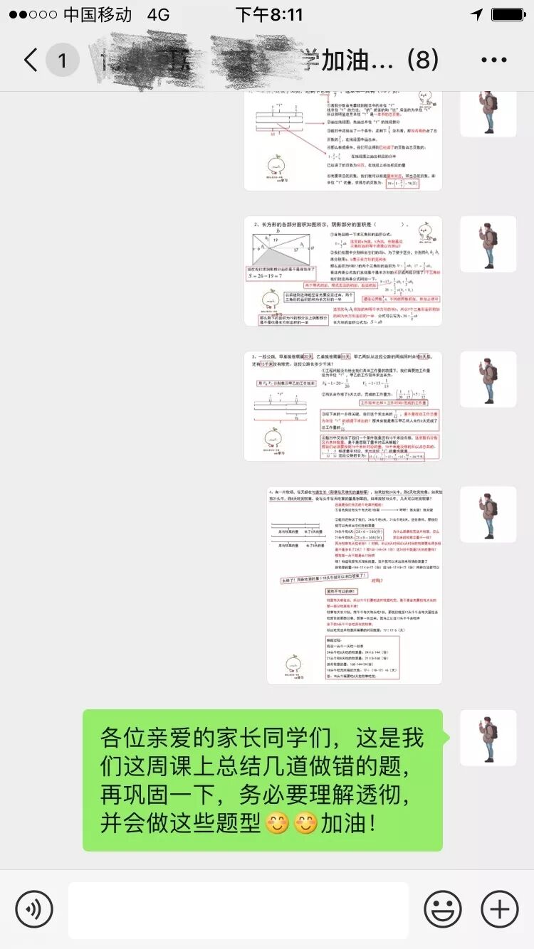 有效的學(xué)習(xí)的前提就是能夠梳理學(xué)習(xí)中的障礙點(diǎn)。作業(yè)的完成情況是學(xué)生知識(shí)點(diǎn)掌握情況最直接的證據(jù)。“叮”“?!泵刻焱砩?點(diǎn)30左右,我的手機(jī)都會(huì)在這個(gè)時(shí)候響起。打開微信里面是曾同學(xué)家長發(fā)來的學(xué)生已經(jīng)完成的作業(yè)。曾同學(xué)是一位六年級(jí)的學(xué)生,但成績一直不是很理想,特別是在一些難題上經(jīng)常失分。這個(gè)時(shí)候,我會(huì)把作業(yè)都檢查一遍,找出里面做錯(cuò)的題,把圖片中這些錯(cuò)題都用紅色圈起來,再發(fā)回給家長,讓曾同學(xué)自己先行把這些題目訂正。